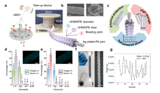 本项工作中,研究人员设计了一种超高强度智能编织纱线(UBSY),并实现了上千米纱线的连续编织。超高分子量聚乙烯纱线外壳赋予了智能纱线优异的强度、耐磨性、耐酸碱液体泼溅性、耐洗涤性和稳定的自供电传感性能。优化后的高致密UBSY直径仅为527 μm,达到了383.12 MPa的超高拉伸应力,单根UBSY可以轻松提起9 kg的水桶,承重性能优异。UBSY与大规模的工业化横机生产适配,得到的全柔性针织智能织物柔软、高强,能准确地感应压力、频率,不仅确保了穿戴者的人身安全和穿着舒适性,还可在复杂、危险的环境中保持稳定的传感能力,为极限运动、军事用途、高风险工业制造活动和高强度医疗缝合等不同领域的复杂特殊环境中的大规模高性能可穿戴应用提供了切实可行的思路。