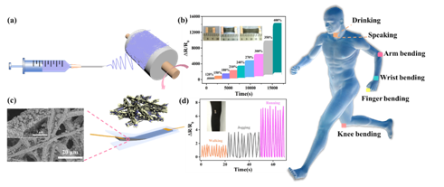 图1. (a)静电纺丝过程示意图;(b)应变传感器在120-400%范围内不同应变下的重复性;(c)应变传感材料SEM图及组装示意图;(d)应变传感材料用于人体步行、慢跑和快跑运动的电阻信号检测。