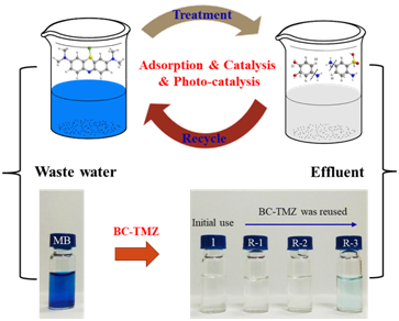 付少海教授团队在SCI核心期刊Journal of Cleaner Production上发表题目为“In situ loading metal oxide particles on bio-chars: Reusable materials for efficient removal of methylene blue from wastewater”的学术论文。研究将MgO、ZnO和TiO2催化材料掺杂、负载在生物炭上,制备成具有吸附-催化降解功能的复合型生物炭多孔材料。该生物炭多孔材料通过吸附-降解-吸附-降解的过程,在紫外光照射下可以有效去除印染废水中的染料污染物,具有优异的可重复利用性能,对印染废水处理和生物炭吸附材料的循环利用具有重要意义。