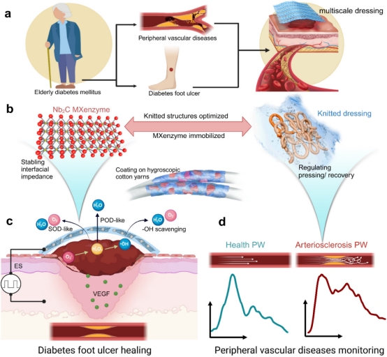 /针织技术教育部工程中心蒋高明教授团队与上海大学陈雨教授团队宋鋆博士、南京医科大学胡本慧教授团队陈中达博士合作的一项关于糖尿病足溃疡(DFUs)和外周血管疾病(PVDs)患者护理的研究取得了重大进展,相关成果在材料领域顶级期刊《ACS Nano》(IF=15.8)上发表,题为“A Knitted and MXenzyme-Integrated Dressing for Geriatrics Diagnosis and Ulcer Healing”。上海大学宋鋆博士与南京医科大学陈中达博士为共同第一作者,黄瓜视频