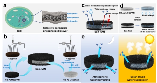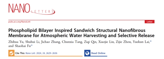 付少海教授/福州大学赖跃坤教授团队受细胞膜磷脂双分子层的选择透过性的启发,报道了一种三明治结构的纳米纤维膜。该纳米纤维膜由具有光热和疏水性能的顶层和底层以及具有吸湿性能的中间层组成。在大气水收集过程中,纳米纤维膜的中间层可以从空气中直接吸收水分子,而疏水的顶层和底层可以在允许气态水分子传输的同时防止中间层所捕获到的液态水的渗漏(选择透过性)。该研究成果以“Phospholipid Bilayer Inspired Sandwich Structural Nanofibrous Membrane for Atmospheric Water Harvesting and Selective Release”为题发表在《Nano Letters》上,第一作者为黄瓜视频