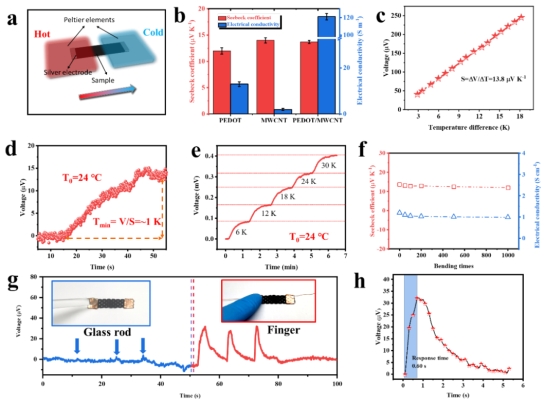 基于PEDOT和MWCNT出色的塞贝克效应,PEDOT/MWCNT@PLF被组装成自供电温度传感器,并在室温下进行了温度灵敏度测试(图1a-c)。此外,该传感器的最低检测限为1 K(图1d-e)。即使经过1000次弯曲,热电织物的电导率和塞贝克系数也仅有轻微下降(图1f),这表明热电特性具有良好的可重复性和稳定性。基于灵敏、稳定的温度识别和连续自供电性能,当玻璃棒和手指接触PEDOT/MWCNT@PLF温度传感器时,分别出现了微弱的负信号和较强的正信号(图1g)。温度传感器的响应时间为0.60 s(图1h)。