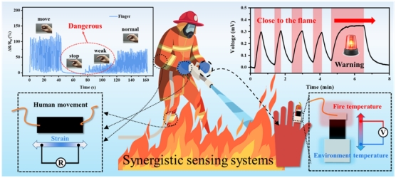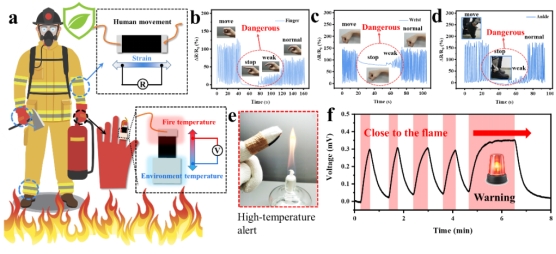 PEDOT/MWCNT@PLF具有灵敏的温度识别能力、良好的机械性能和拉伸性,因此被开发成一种自供电双参数传感器,具有健康异常和温度阈值警报功能。双模式传感器被集成到手腕、手指、膝盖和脚踝等身体关节处,以实时检测使用者的运动;并集成到舒适层和隔热层之间,以监测消防服的破损情况。一旦消防员在事故现场被困或受伤,或消防服隔热层的温度达到临界值,双参数传感将实时提醒消防员健康异常,并提醒基地工作人员及时实施救援,保护消防员的人身安全。根据相对电阻可重复和有规律的变化,可以区分手腕、手指和脚踝的信号。相对电阻变化的幅度也可以通过连续监测进行分析。如果信号相对较小,则说明消防员处于危险之中,需要立即得到支持和帮助(图3a-d)。当智能手套靠近火焰时,PEDOT/MWCNT@PLF的两端形成了体温与火焰温度之间的温差,因此该传感器可以快速响应热电压信号。离开高温环境后,产生的热电压信号消失。用于模拟当输出的热电压超过阈值时,提醒消防服已损坏,必须及时更换或降温,确保消防员的人身安全(图3e-f)。