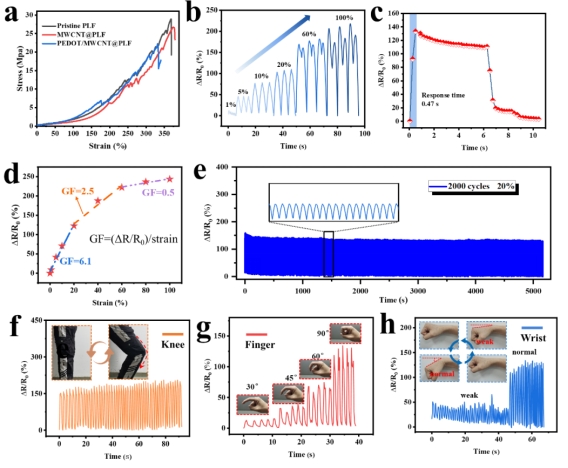 PEDOT/MWCNT@PLF传感器不仅对温度敏感,而且具有良好的机械性能和拉伸性。每个织物样品都能完成超过320%的应变(图2a),完全适合用于人体关节健康监测的智能可穿戴设备。该应变传感器成功检测到的最小和最大应变值分别为1%和100%(图2b)。拉伸会破坏导电通路,直接影响织物的导电性。传感器在50%应变时的响应时间为0.47秒(图2c-d)。在50%应变下重复拉伸2000次后,传感器对应变的实时响应非常稳定,波动极小(图2e)。应变传感器对于不同的手指弯曲角度(30°、45°、60°和90°)也会响应正相关的电信号(图2g)。利用集成在手腕上的应变传感器可以分辨手腕弯曲的幅度(图2h)。