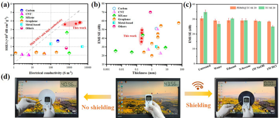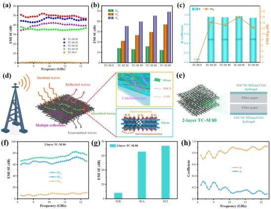 本项工作以TEMPO氧化纤维素纳米纤维(TOCNF)为主要原料,通过与阳离子瓜尔豆胶(CGG)自组装形成水凝胶,在纤维素纸表面封装MXene,构建了一种电磁屏蔽复合纸(TC-M)。结果显示,复合纸的电导率为3843 S·m−1,EMI屏蔽效能(EMI SE)达到49.37 dB,且组装形成的双层复合纸EMI SE高达73.99 dB。此外,聚二甲基硅氧烷(PDMS)的引入保护了复合纸的EMI屏蔽性能,改善了复合纸的耐用性。