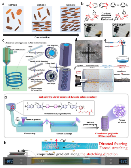 此外,为了应对湿法纺气凝胶纤维过程中遇到的特定挑战和需求,还有许多先进的湿法纺丝技术,如液晶纺(图4a)、反应纺(图4b)、同轴纺(图4c)、微流控纺丝(图4d)、干湿纺(图4e)、液体模板(图4f)、紫外辅助交联(图4g)、定向冷冻湿纺(图4h)。这些先进技术的开发是为了满足气凝胶纤维连续喝大规模生产中的具体要求,如提高机械性能、控制孔结构和增强脆弱气凝胶材料的可加工性。