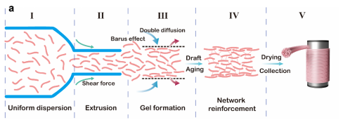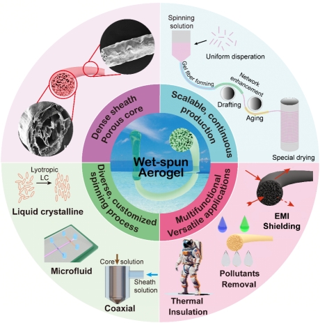 气凝胶纤维是一种轻质、多孔、柔韧且多功能的材料,集气凝胶和纤维材料的优点于一身,在热绝缘、污染吸附、生物医药、能源存储和航空航天等领域具有广阔的应用前景。然而,脆弱的机械性能限制其应用和大规模连续化的制备仍是重大挑战。