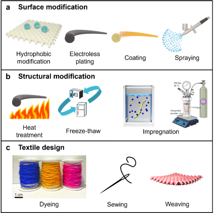 湿法纺气凝胶纤维的工艺(图2a)主要包括:(1)纺丝液制备:通过溶胶-凝胶法或纳米组元交联法制备稳定的溶胶溶液;(2)纺丝液挤出:将纺丝溶液在一定速度下通过针头、喷丝孔等挤出到凝固浴中;(3)凝胶纤维在凝固浴中成型:在凝固浴中发生溶剂和非溶剂的双扩散过程,导致相分离形成凝胶纤维;(4)拉伸和老化:对凝胶纤维进行拉伸和老化处理,进一步增强网络结构;(5)干燥:采用超临界干燥、冻干或常压干燥等方法去除凝胶纤维内部的液相,保留网络结构。每个工艺步骤都会深刻影响纤维的结构和性能。通过精细调整工艺条件,可以优化气凝胶纤维的网络结构和力学性能,不仅实现连续生产,还能根据需求提升纤维的质量和功能。此外,气凝胶纤维具有丰富的后整理工艺(图3),通过表面改性、结构优化、纺织设计等手段,赋予气凝胶纤维更多功能,提高热稳定性和机械性能,并能使其获得多样的外观。