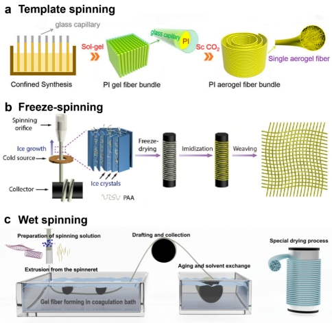 与块状气凝胶相比,气凝胶纤维具有高度柔韧性和可编织性,能够更容易地集成到各种形状和尺寸的应用中。制备气凝胶的方法包括模板纺丝(图1a)、冷冻纺丝(图1b)和湿法纺丝(图1c)。其中模板纺丝需要特定模板辅助,凝胶速度通常较慢,难以实现连续大规模生产;冷冻纺丝可以实现连续的纤维生产,并能通过工艺参数的调整控制多孔结构,但其制备的气凝胶纤维孔径较大,可加工性不够丰富。湿法纺丝可以实现连续的凝胶纤维成型,并且具有更加便利的加工特性,能实现精细化地调控纤维结构。因此,湿法纺丝是目前连续化制备气凝胶纤维的最有前景的方法之一。