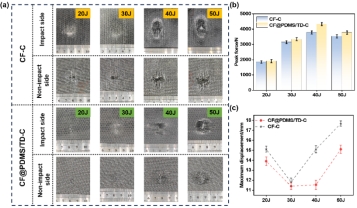 图6 (a)碳纤维针织复合材料冲击性能,(b-c)碳纤维复合材料最大冲击力与最大冲击位移