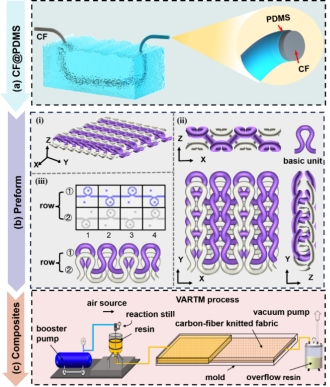 图1 (a) PDMS包覆碳纤维工艺,(b)双罗纹结构以及(c)VARTM制备工艺示意图