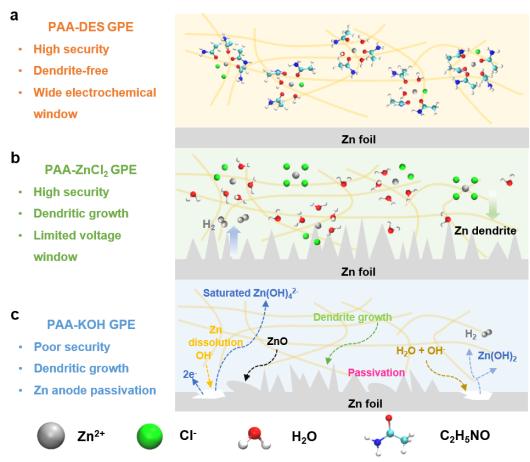 的魏取福教授团队通过深共晶溶剂作为电解液,引入聚合物网络制备出新型共晶凝胶电解质来改善柔性锌空气电池中枝晶生长的问题,同时显著提高了锌空气电池的循环寿命。研究发现,共晶溶剂中独特的锌离子溶剂化结构,拓宽了电解质的电化学窗口,为锌阳极提供稳定的工作环境;共晶凝胶电解质优异的电解质保持率和形态稳定性使锌空气电池实现了超长的工作时间。该电解质制备策略以其低成本、易合成和可扩展性等优势,为储能器件的发展提供了新思路。