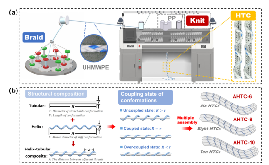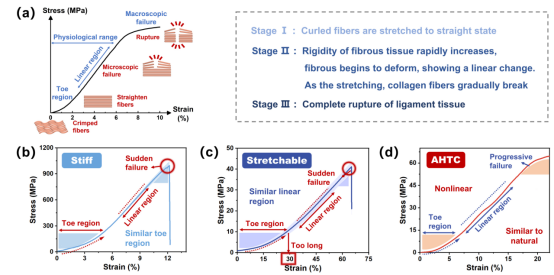 针对这一挑战,本研究利用针织全成形技术,成功研制出一种具有仿生结构特征的新型复合材料(HTC/AHTC)。这一突破性设计巧妙地将刚性螺旋构象与弹性可拉伸构象相结合,通过精准调控结构参数与次级构象的耦合状态,实现了对材料力学性能的"编程"。实验结果表明,该材料不仅完美复刻了天然韧带的非线性力学行为,更展现出优异的抗疲劳性能。这一进展不仅解决了人工韧带力学性能不匹配的核心难题,更为运动医学领域提供了全新的解决方案。