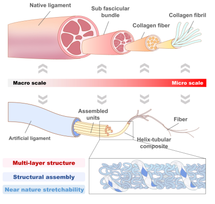 前交叉韧带(ACL)重建一直是运动医学的重点和难点,其对维持膝关节的稳定性及功能性具有至关重要的作用。天然ACL之所以能够承受复杂的力学环境,得益于其精妙的层次结构。其中,"卷曲"的胶原纤维在受力时展现出独特的非线性力学行为,既能提供初始的弹性,又能在高强度下保持稳定性。然而,现有的人工韧带材料难以复刻这一特性,导致植入后容易出现关节稳定性不足、力学性能不匹配等问题,甚至可能引发退行性关节炎等并发症。