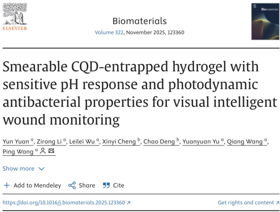 无锡医学院邓超副教授合作,在生物材料领域国际顶级期刊《Biomaterials》发表题为“Smearable CQD-entrapped hydrogel with sensitive pH response and photodynamic antibacterial properties for visual intelligent wound monitoring”的研究论文,通过纤维素纳米纤维、单宁酸和聚乙烯醇的氢键网络包埋表面羧化的碳量子点(mCQD),制备了一种可涂抹的C-P-T/mCQDs水凝胶,用于伤口感染和愈合状态的实时监测。