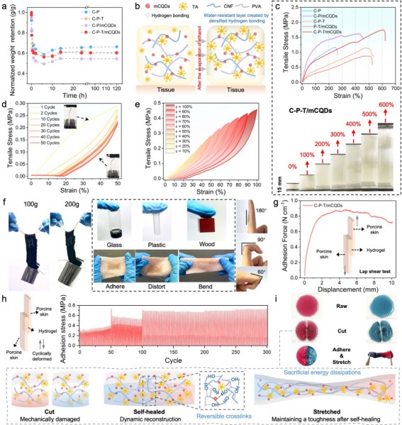 图2. C-P-T/mCQD水凝胶的机械性能及自愈合能力评价
