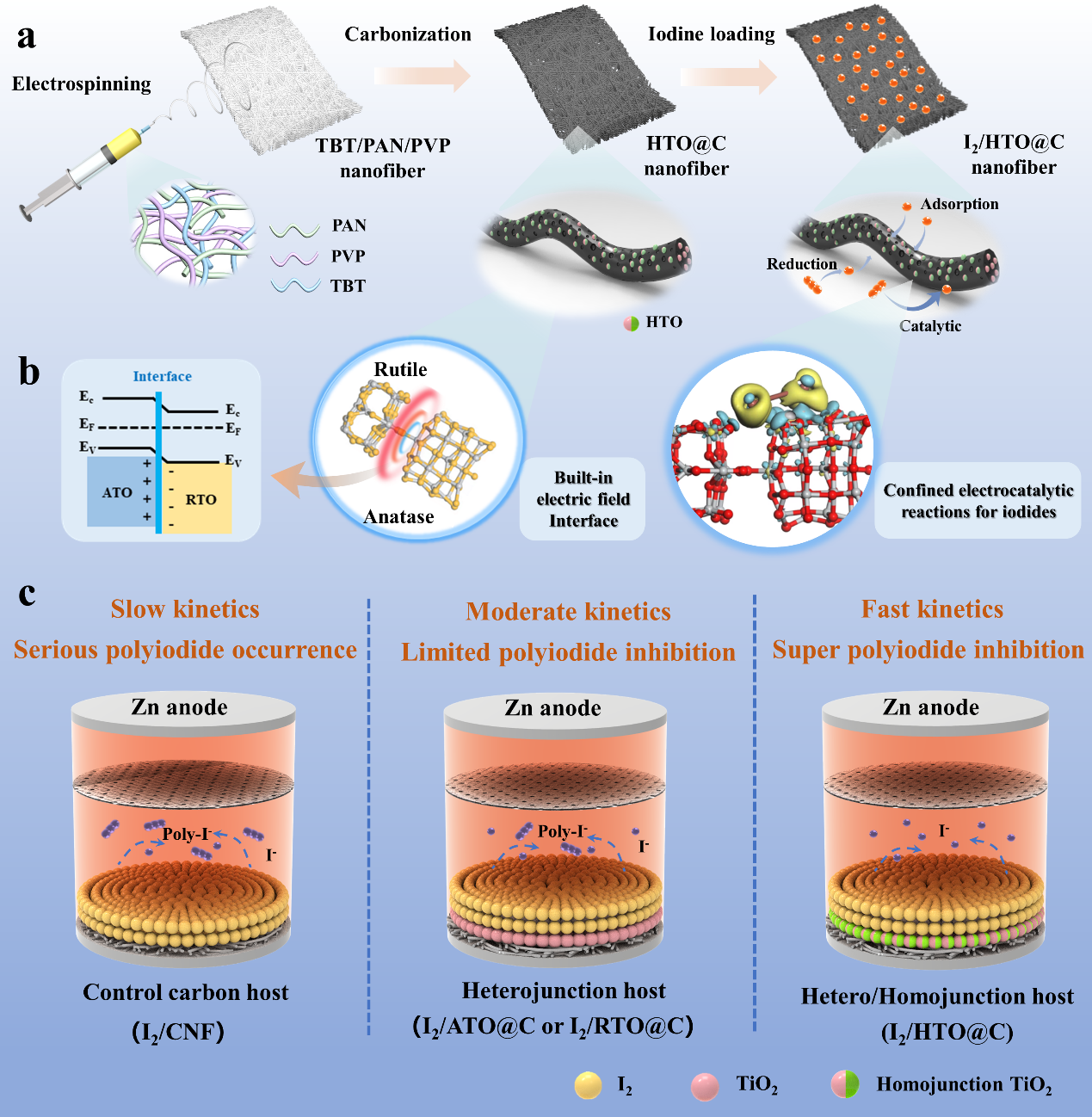锌-碘电池因其高理论容量、丰富的资源储备和良好的环境友好性,成为下一代储能技术的重要候选。然而,碘正极在循环过程中存在严重的穿梭效应和导电性差等问题,严重制约了其实际应用。针对这一挑战,该工作设计并构建了一种具有TiO2同质结的多孔异质碳纳米纤维宿主材料(HTO@C),用于高效锚定碘物种并提升电池性能。
