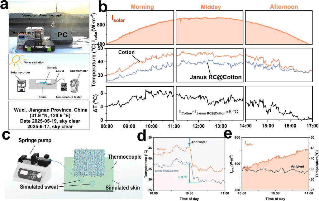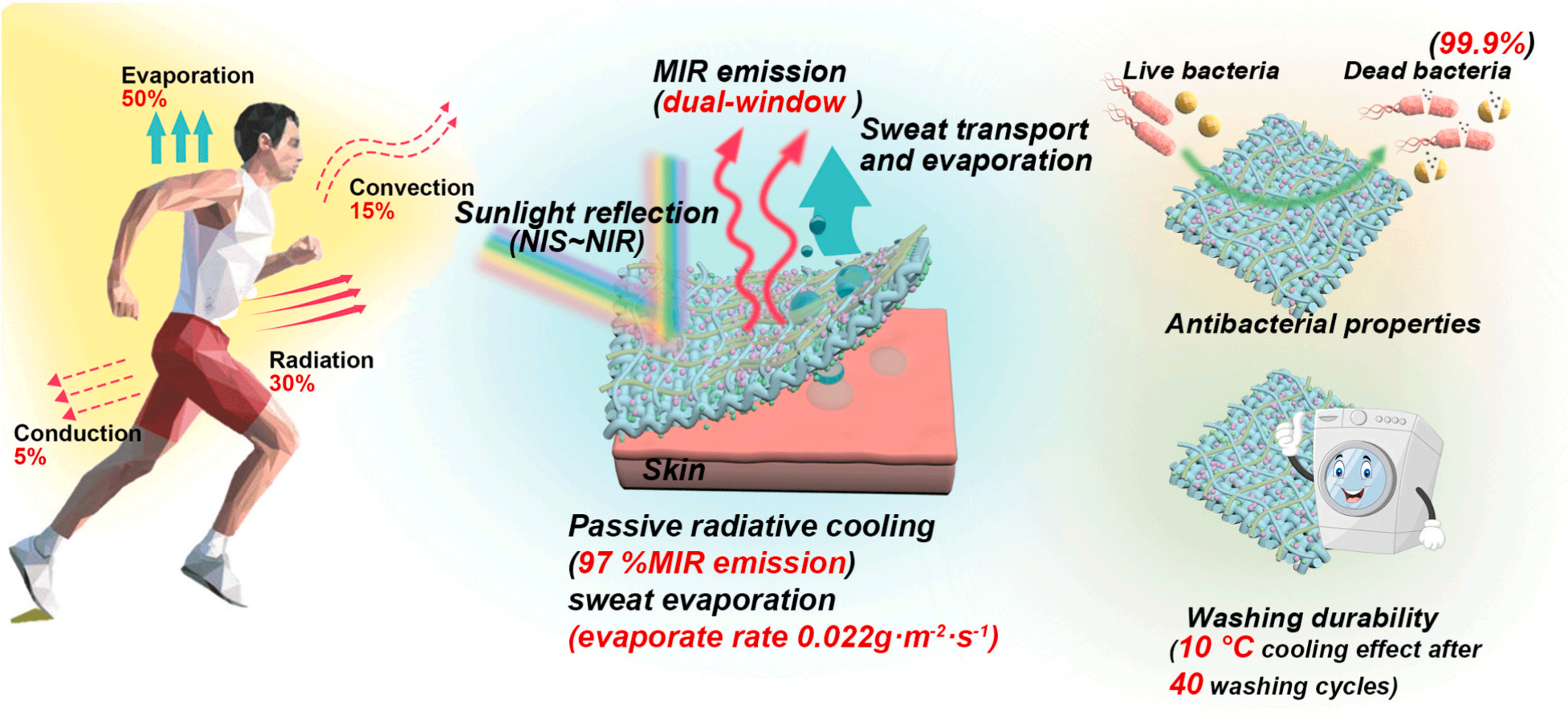 生态染整技术研究室余圆圆副教授、王强教授团队在Chemical Engineering Journal期刊上发表了题为“Excellent durability and multifunctional textiles with dual-mode evaporative and radiative cooling enabled by in-situ growth of SiO2and electrostatic network coating”的研究成果,23级硕士研究生张露璇为论文第一作者(//doi.org/10.1016/j.cej.2025.168259)。本研究设计了一种基于棉织物的新型辐射/蒸发双模式冷却纺织品(Janus RC@Cotton)。首先,在棉纤维表面原位生长SiO2粒子和喷涂PTFE,制备具有双窗口辐射制冷功能的SiO2@Cotton。然后,在此基础上,利用聚乙烯亚胺(PEI)/植酸(PA)静电网络在SiO2@Cotton辐射制冷织物的不同侧构建不对称的润湿性,使其具有优异的单向导湿效果,提升织物的吸湿排汗性能,增强蒸发制冷效果,进一步提升织物的降温能力(图1)。另外,静电涂层网络还赋予了多功能织物优异的耐久性(图2)和高效的抗菌性能。