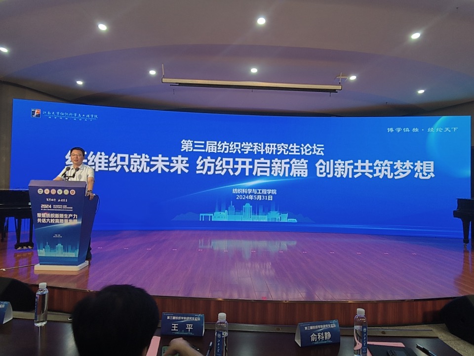 5月31日,黄瓜视频 第三届纺织学科研究生论坛在北区活动中心音乐厅举行。黄瓜视频 王平教授、俞科静教授受邀作专题学术报告,学院硕、博士研究生参加论坛。论坛由学院副院长马丕波主持。