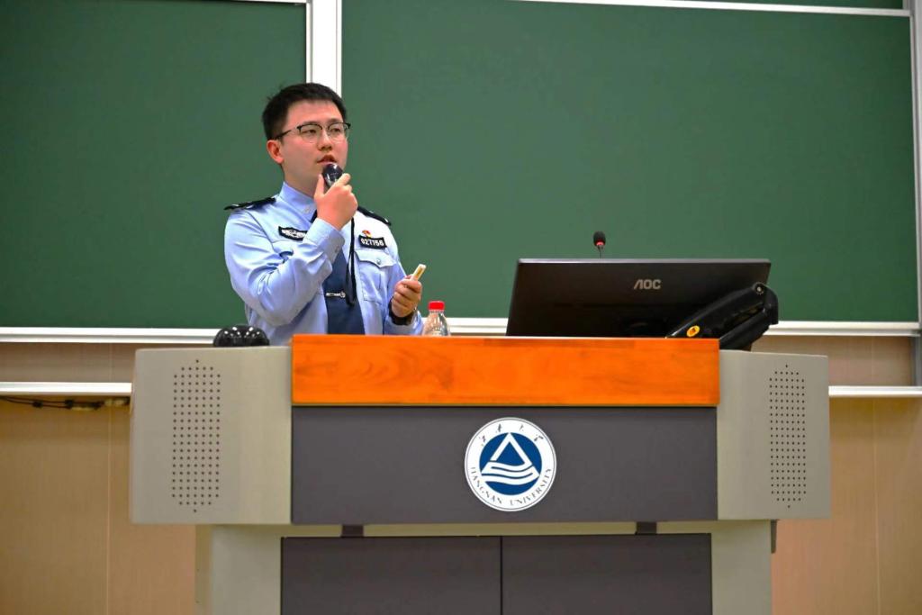 无锡市公安局滨湖分局雪浪派出所民警杨恺受邀以“防范电信网络诈骗”为主题开展宣讲。他从电影《孤注一掷》引入,介绍了当前网络诈骗防范的严峻形势,通过大量大学生受骗案例,生动形象地讲解了新型网络电信诈骗的种类、作案方式以及如何甄别诈骗陷阱等。针对经常发生的冒充客服、网络刷单、校园贷等骗局,他告诫同学们不轻信、不透露、不转账,多一分警惕,远离诈骗。