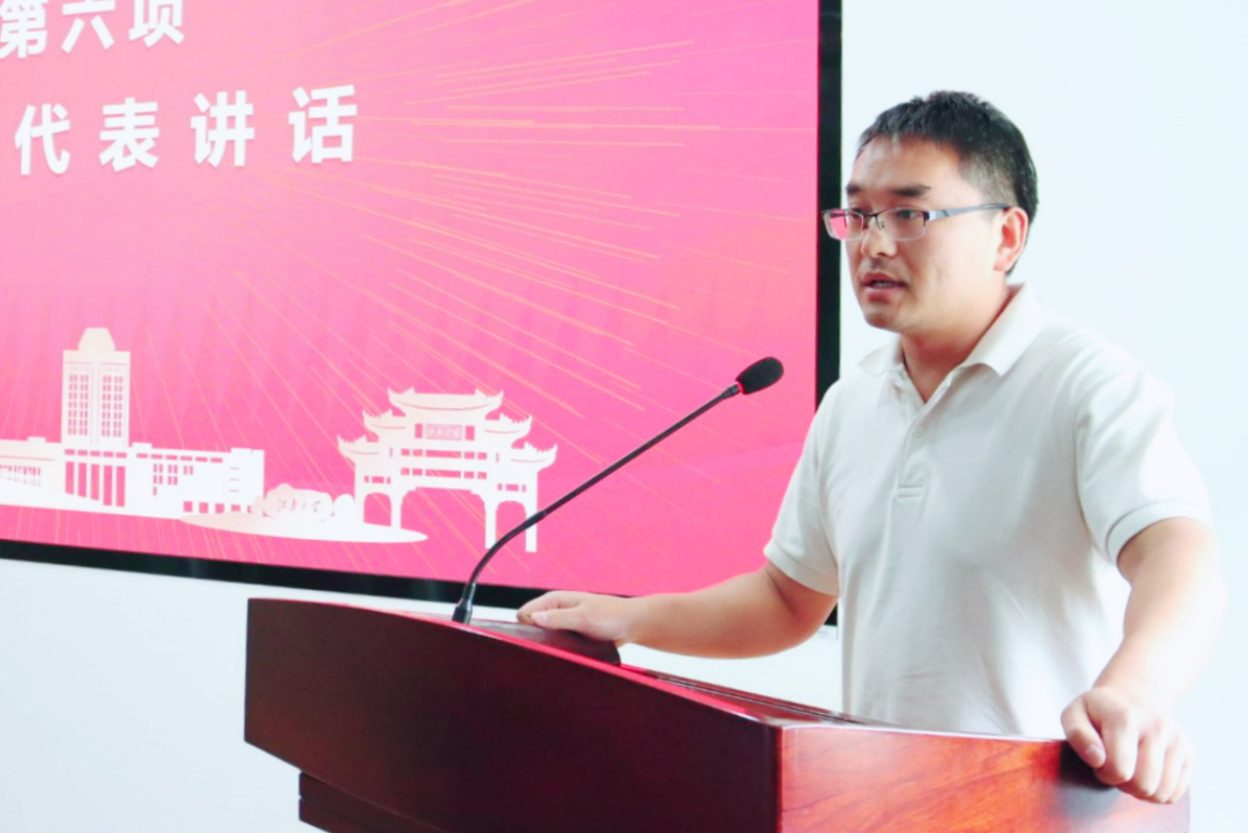 教师代表朱亚楠上台讲话,他向同学们提出了三点建议:第一,要深耕专业,努力学习专业理论知识,同时结合实践,多多操作丰富阅历;第二,要不断开拓创新,创新永远是我们收获知识的法宝,要勤学多问而不循规蹈矩;第三,要重视身体锻炼,在学习的同时注重身体健康。