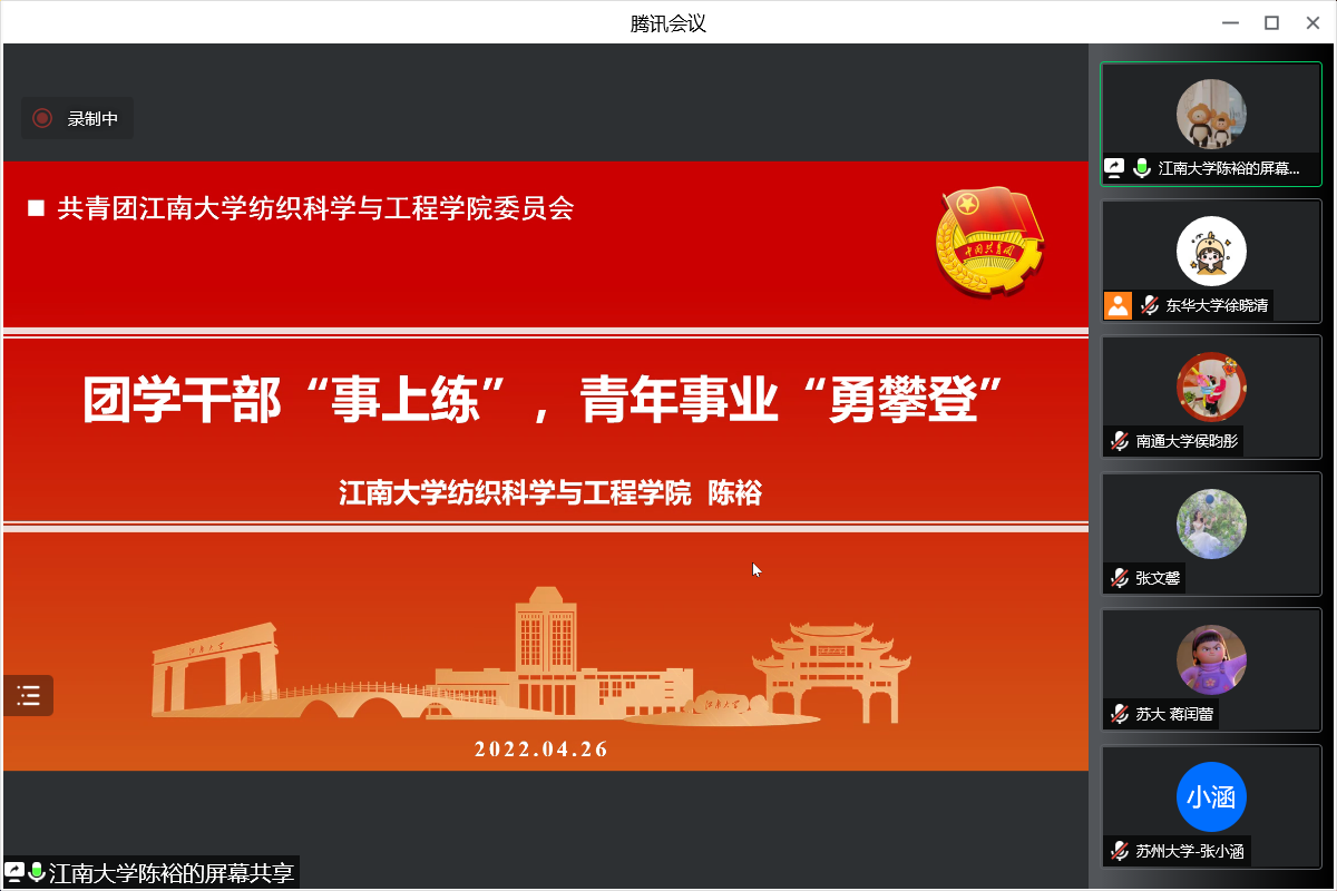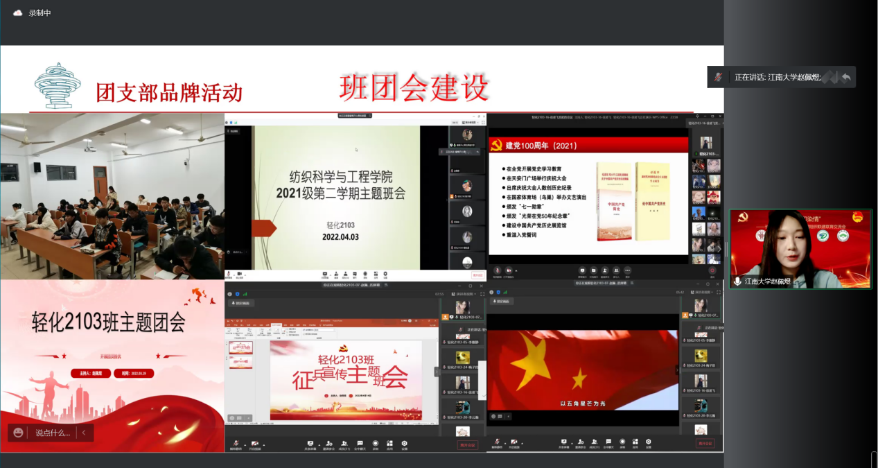、浙江理工大学、南通大学五校共建学院的党委副书记、学工办主任、团委书记及15个党、团支部500余名师生相聚“云端”,就纺织印染类高校党团组织建设建言献策,通过交流分享,集思广益,共同助力联建联育成效落到实处。交流会由东华大学化学化工与生物工程学院学工办主任王学保老师主持。