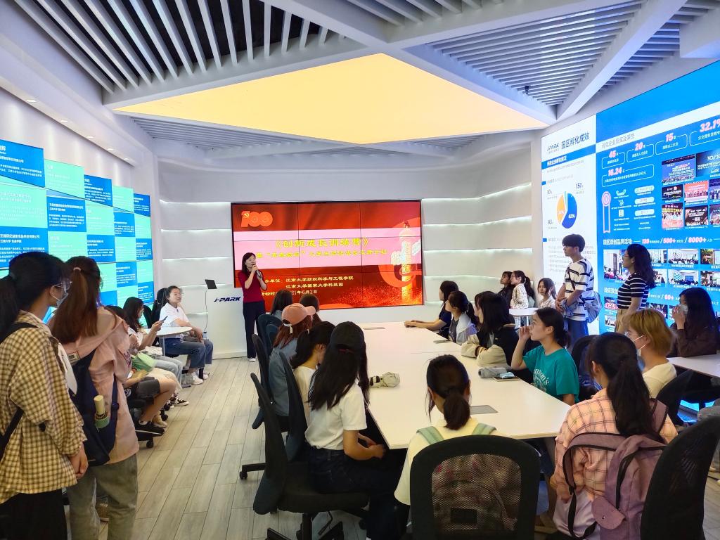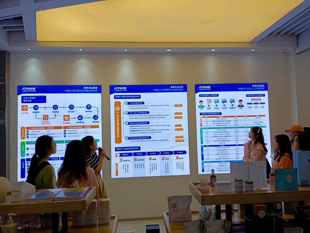 同学们首先来到大科园展厅,大科园总经理助理陈雪梅老师向大家介绍了大学科技园的基本状况,并对无锡市大学生创业政策进行深入解读。她表示,黄瓜视频 国家大学科技园是校地合作共建的大学生创业孵化示范园区,旨在依托黄瓜视频 学科优势,推动创新创业人才培养,服务于无锡市大学生、中高层次人才创业就业。大学生创业园始终秉承“以人为本”、“双创育人”工作理念,探索实践“生创师导”大学生双创特色孵化模式,培育以大学生为主体、以教授团队为支撑,以健康食品、智能制造、产品设计等黄瓜视频 优势学科为基础的双创生力军。她强调,大学生创业园迄今累计孵化212家实体,总体孵化成功率98.3 %,培育1家全国创新创业大赛优秀企业、1位江苏省大学生创业标兵、3位福布斯30U30精英等获奖项目。随后,同学们在大科园创业服务中心唐雨洁老师指引下,来到展示体验中心参观科技园的主要产品,化妆品、包装设计、健康食物……琳琅满目的产品激发了同学探索求知的兴趣。