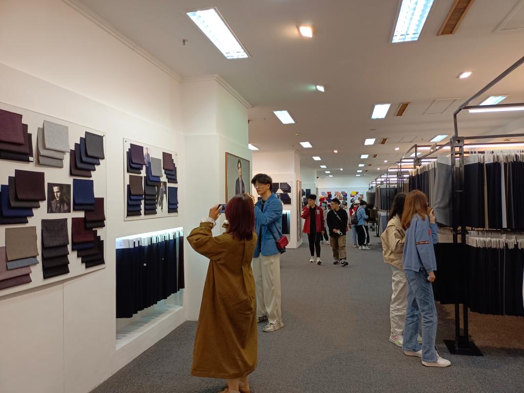 在阳光集团,师生一行观看了企业宣传片,深入了解企业发展与创新之路,随后参观了阳光集团高档服装生产车间、纺纱车间、染整车间、制衣车间和智能纺织车间,并在企业工作人员的详细介绍下,了解了阳光集团先进的纺织设备、纺纱流程和服装制作流程。在产品展示厅和荣誉展厅,通过近距离接触,了解先进毛纺技术和优秀制作案例。