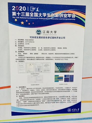 杨瑞华副教授指导2018级本科生张康磊等负责的国家级创业训练项目《可持续发展的彩色梦幻面料开发公司》从众多项目中脱颖而出,入选本届年会,进行线上展示。