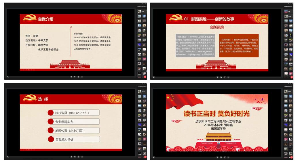 七名在升学、创新创业等方面成绩斐然的学生党员,结合自身经历,从专业学习、学科竞赛、学术科研、国内深造、出国留学、公益服务等维度做主题报告。学生党支部书记、委员,本科生、研究生低年级党员,入党积极分子、发展对象共160余人聆听主题报告。