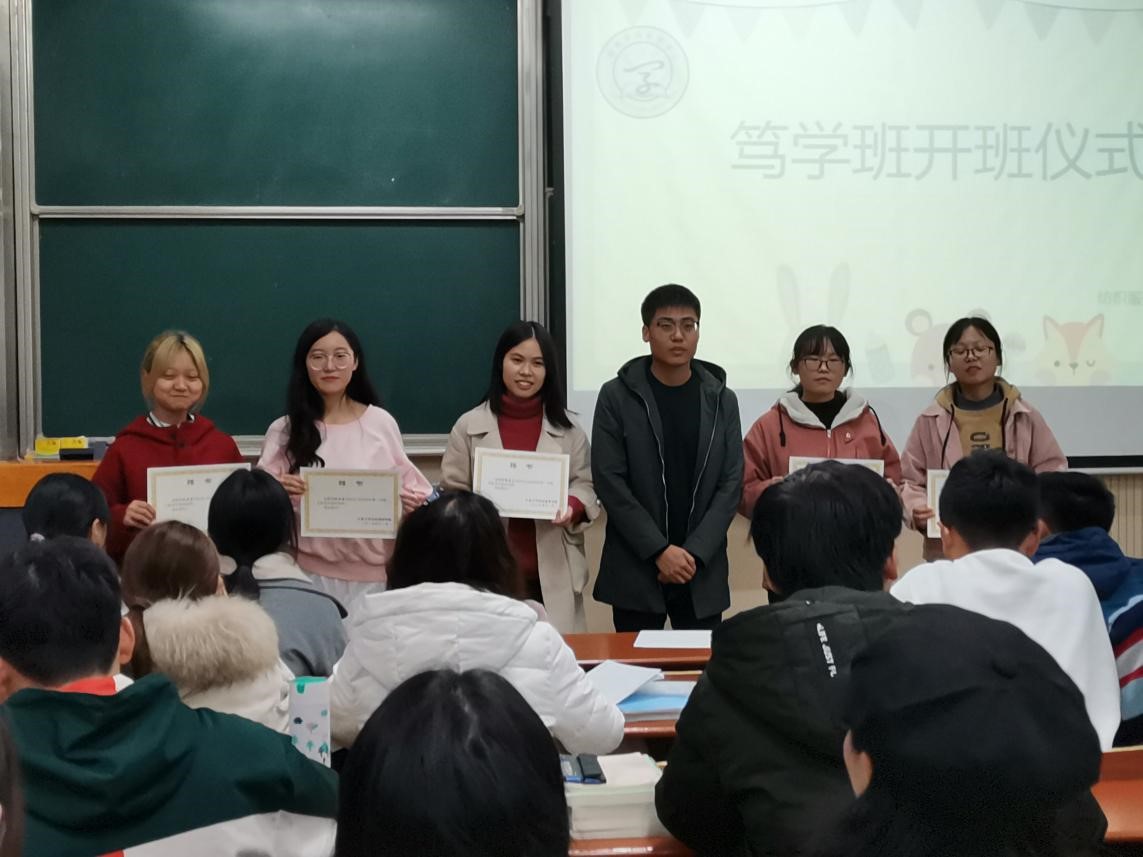 开班仪式上,于乐老师向2019级新生介绍了笃学班建立的初衷,通过举办朋辈帮扶活动,对历年考试挂科较为严重的科目重难点开展一对多的课程讲授,营造良好的朋辈互助氛围。他希望同学们能够充分利用学院搭建的学业帮扶平台,学有所思、学有所得、学有所获。随后,于乐老师为钱亚菲、吴柔芬等6位同学颁发学业辅导员聘书。