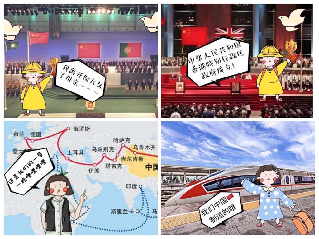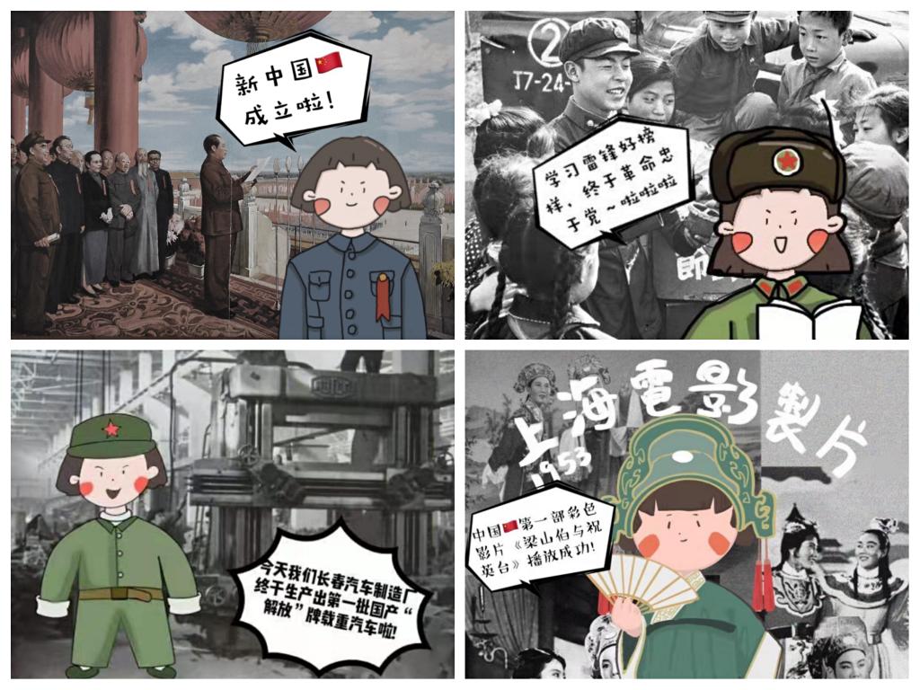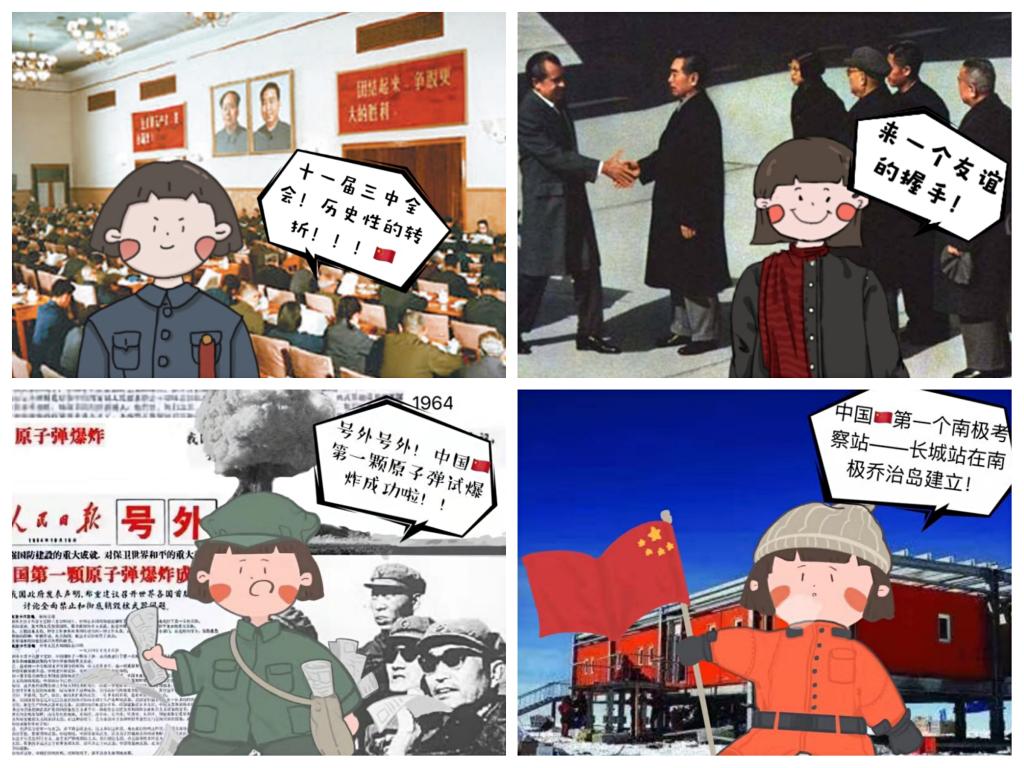 纺织服装学院本科生低年级党支部党员作为“阿中哥”的“铁粉”,拿起画笔,把对“阿中哥”的爱凝成笔下一位追寻强国梦的女孩——小纺。她穿上那个时代或是流行服装,或是工作制服,与珍贵历史合影,以回溯“阿中哥”风雨兼程、砥砺前行的伟大历程,全面呈现“阿中哥”70年发展成就。