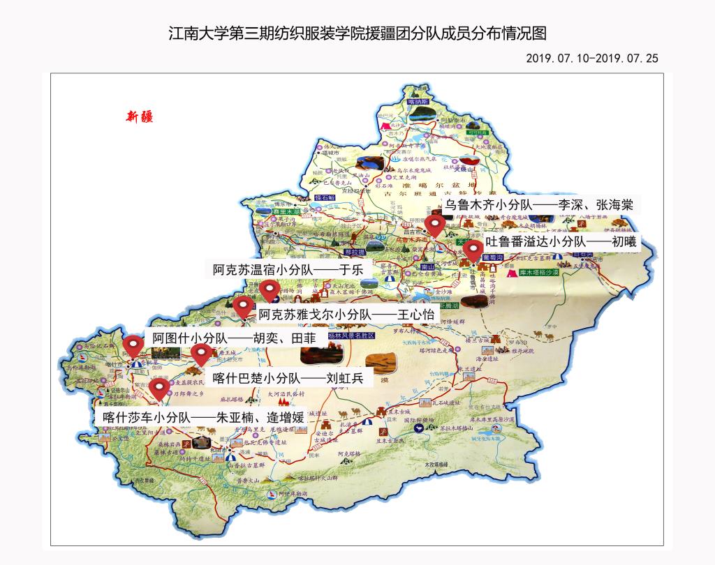 2019年暑期援疆实践团成员以小分队的形式奔赴新疆的4个地州的8个实践点展开主题授课和专题调研等活动,其中实践点覆盖职业院校、服装企业、质检部门等。