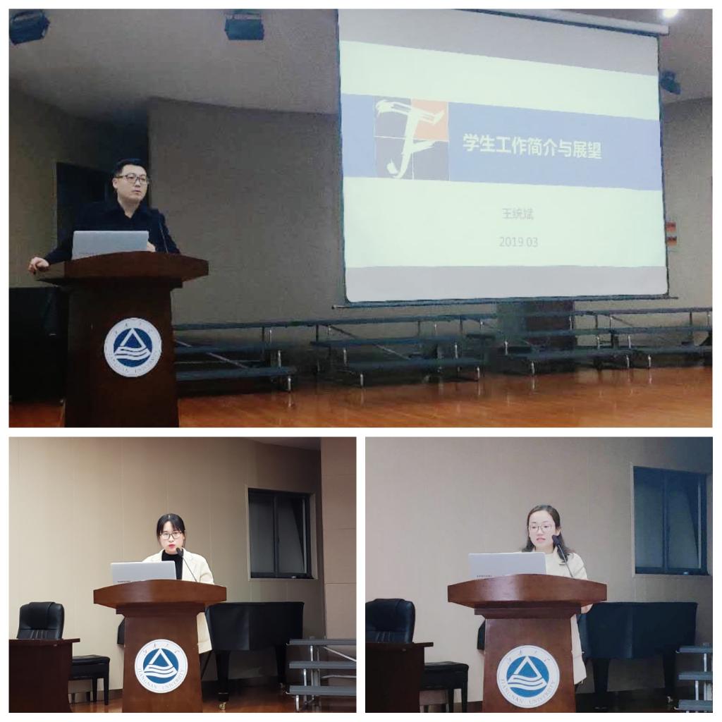 学院辅导员对分管学生工作情况进行了说明。院分团委书记、学工办主任、18级服装系辅导员王统斌从思想引导、日常管理、学生组织工作方面介绍了学工办工作、团工作、年级工作,强调发挥学生组织的抓手、纽带、桥梁作用,提升学生“自我管理、自我教育、自我服务、自我成长”的能力。院分团委副书记、高年级研究生辅导员徐雅静重点讲解了学风建设年度计划和研究生就业工作思路。18级研究生辅导员叶青介绍了详细介绍了研究生奖助政策,向学生推介学院特色思政栏目“教授茶座”活动。15级本科生辅导员陈裕着重介绍了本科生奖惩资助、综合测评、安全稳定、就业创业工作。16级本科生辅导员马倩如回顾了2018年社会奖助、国际交流、学科竞赛的成绩并提出2019年工作思路与举措。17级本科生辅导员吴丹介绍了学生党建工作,重点解读了学生党员发展工作流程。18级纺织系、轻化系辅导员于乐介绍了心理健康教育、体育精神培育、至善生工作。