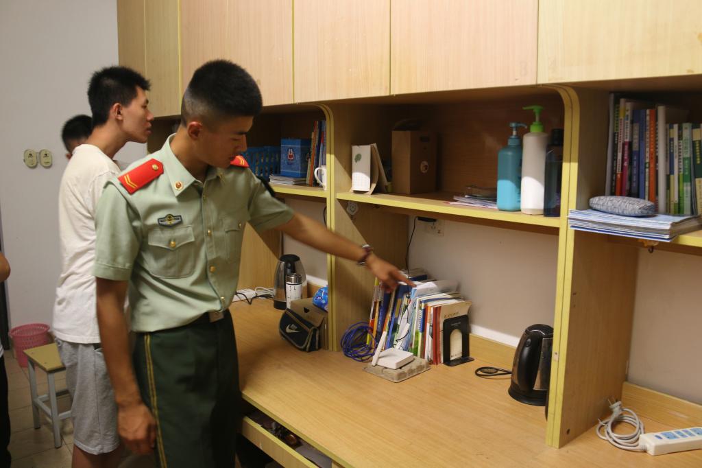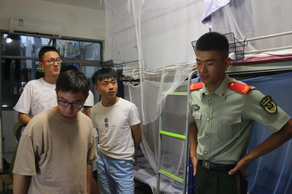 纺服学院参训学生在宿舍与教官交流如何整理内务