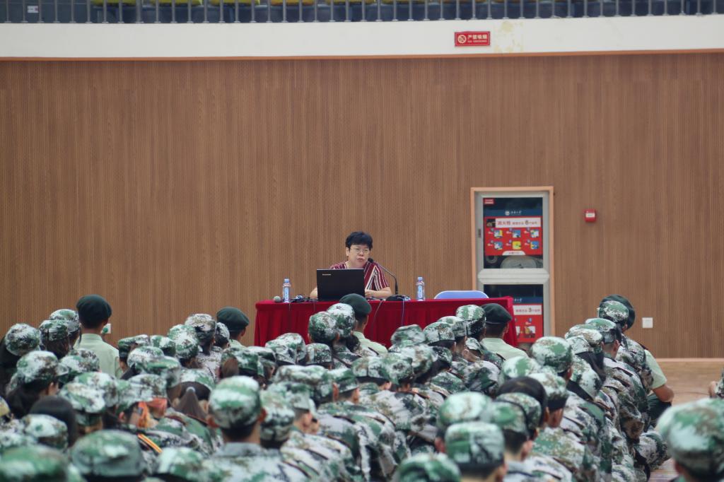 校医院叶军主讲。纺服学院全体参训人员及教官参加此次讲座。