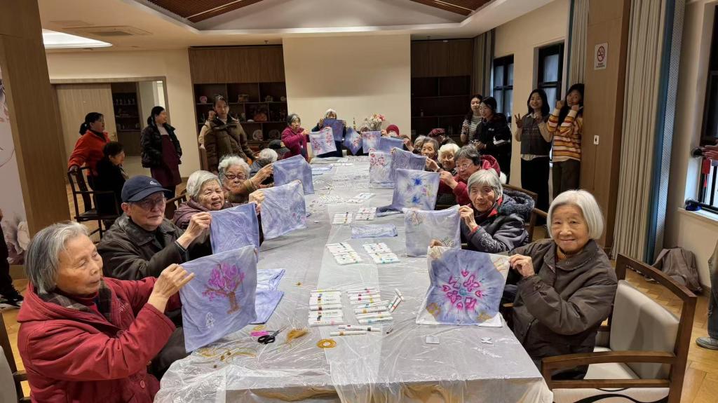 看着自己亲手制作完成的扎染枕套,老人们脸上洋溢着幸福与自豪的笑容,他们爱不释手,纷纷在镜头前开心展示。此刻,颐养中心里充满欢声笑语,温情在空气中弥漫。