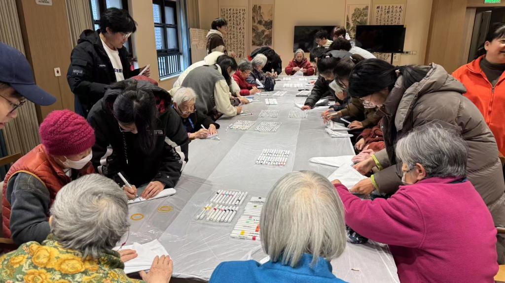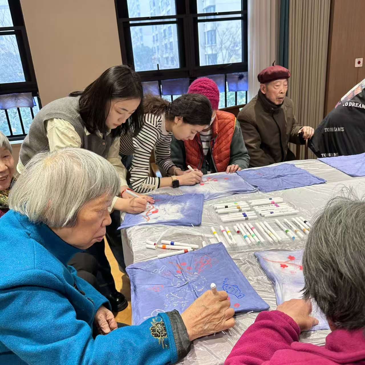 同学们满怀热忱来到颐养中心,他们充分发挥专业优势,将课堂所学融入志愿活动,与老人们共同制作扎染枕套。