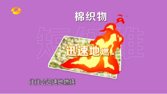 殷允杰教授提到:作为服装面料,常用到的纤维种类分为两大类,一种是天然纤维,如棉、羊毛,都属于短纤维;另一种是合成纤维,如涤纶纤维、锦纶纤维、腈纶纤维,成衣时可用长纤维。一般来说短纤维,如棉纤维,编织的面料会因细微毛羽较多、纤维表面绒毛与空气中的氧气充分结合,遇到明火会迅速燃烧。栏目也通过实验证实了这一观点,这与人们通常以为的“聚酯纤维衣服更易燃烧”截然相反。