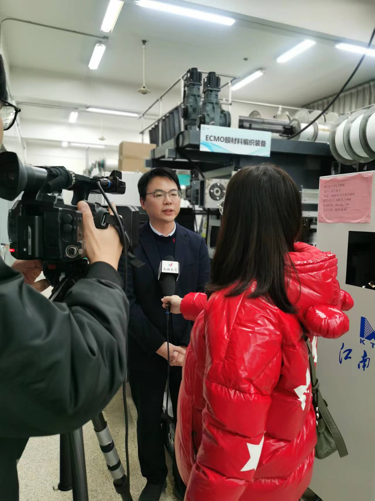 电视台重点报道了针织中心在体外呼吸机方面的技术攻关。据悉,体外呼吸机虽已实现国产,但它所使用的耗材还是被国外所垄断,研究中心蒋高明教授团队和深圳国家高性能医疗器械创新中心郑海荣院士团队合作,双方经过一年多的技术攻关,成功解决“膜材料”这个“卡脖子”关键技术难点,近期,国内首台体外呼吸机膜材料编织装备即将验收,预计2024年投入使用。