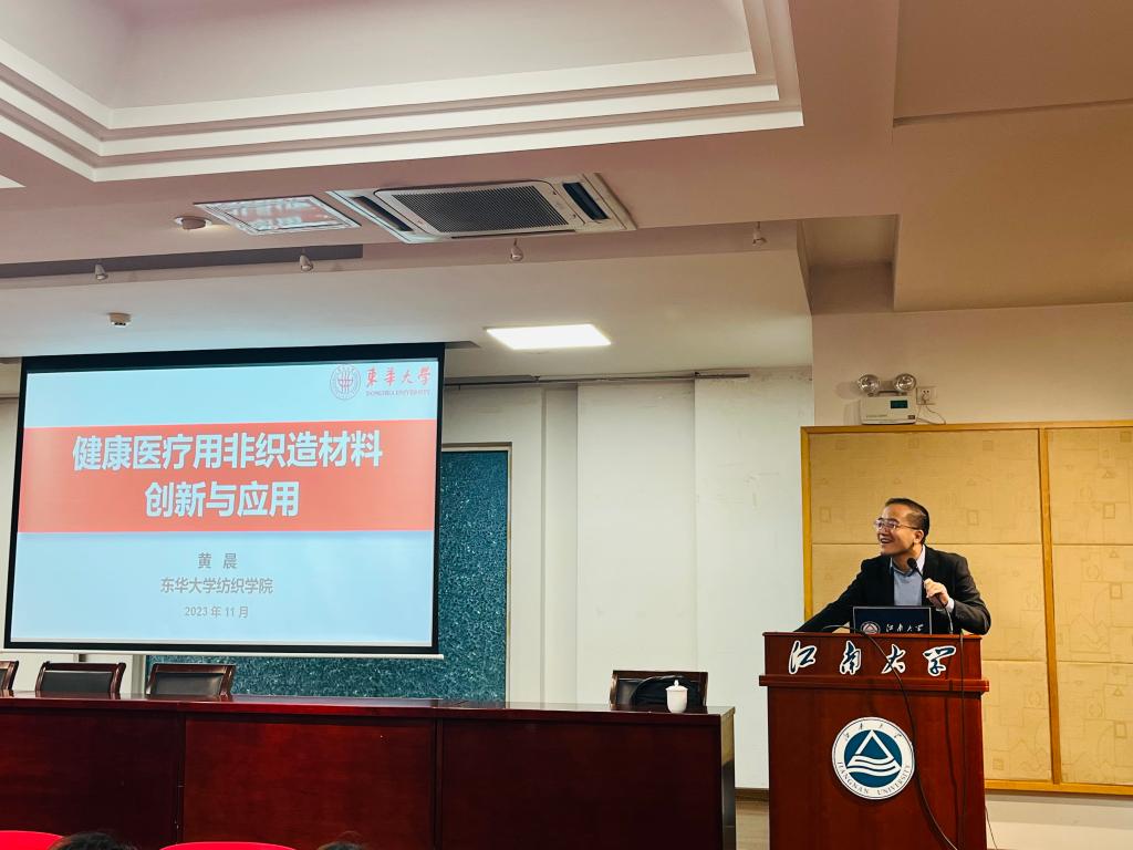 黄晨以《健康医疗用非织造材料的创新与应用》为题,围绕定向导流非织造材料、健康检测非织造材料、非织造基医疗健康制品三个方面,从材料的定义、制备方法以及在各个健康医疗领域上的应用为大家做深入讲解,他还结合自己与团队的研究成果,通过大量的图片与视频向师生展示了新材料与新科技的发展现状与未来趋势。