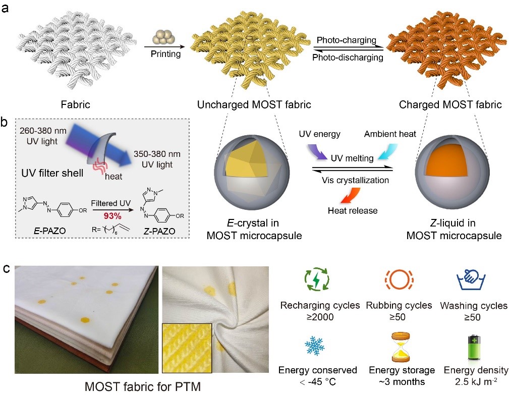 高效耐久型分子太阳能热管理织物能够对人体表面微环境温度进行调控,获得人体舒适、健康的温度。相较于供暖、通风和空调等对环境温度调控方法,高效耐久型分子太阳能热管理织物提高了能量的利用效率,并以太阳能作为能量源,缓解化石燃料消耗带来的碳排放以及污染问题,也为构建集太阳能吸收、转化、储存以及可控释放为一体的光储能织物提供一条有效途径。