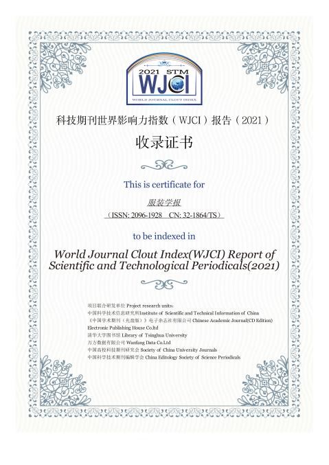 《科技期刊世界影响力指数(WJCI)报告》(以下简称《WJCI报告》)是中国科协课题《面向国际的科技期刊影响力综合评价方法研究》、《科技期刊世界影响力指数(2021版)研制》的研究成果,从全球约6万种科技学术期刊中遴选最具地区代表性、学科代表性、行业代表性的优秀期刊1.5万种左右为来源期刊。《服装学报》入选2021版《WJCI报告》,国内仅11本纺织科学类期刊被收录,《服装学报》位列第10。