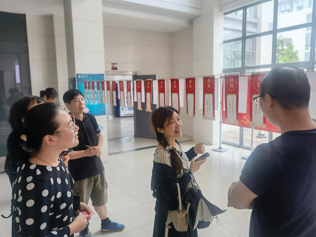 “艰险当头,首先得干(打一党史人物)”、“革命火种(打一节日)”、“晴天为何打伞(打一党史事件)”……百年党史的光辉历程和党史党情化作一道道趣味十足的谜语。在现场,大家三五成群,热情高涨,或苦思冥想,或脑洞大开,猜出谜底后喜笑颜开,得知谜底后恍然大悟,答案有争议时相互探寻,现场每个人脸上都洋溢着开心的笑容。在轻松愉悦的氛围中,一个个历史事件、一位位历史人物印入了脑海,刻在了心中,润物无声地加深了广大教师对党的十九大精神、党规党纪、党史知识的理解和认识,助推党史学习入脑入心。短短2个小时,50余条谜语被大家先后抢空并一一竞猜得到谜底。