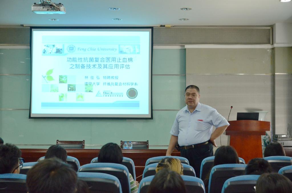 纺织服装学院副院长潘如如教授主持开场。首先由逢甲大学纤维与复合材料学系林佳弘教授带来学术报告,他对功能性抗菌复合医用止血棉之制备技术及其应用评估进行了阐述,包含纺织概念、分类到纺织结构复合材料、纺织复合材料的定义等介绍,用问答的方式更好地调动了大家的积极性,还介绍了目前的工作业绩和主要研究成果。