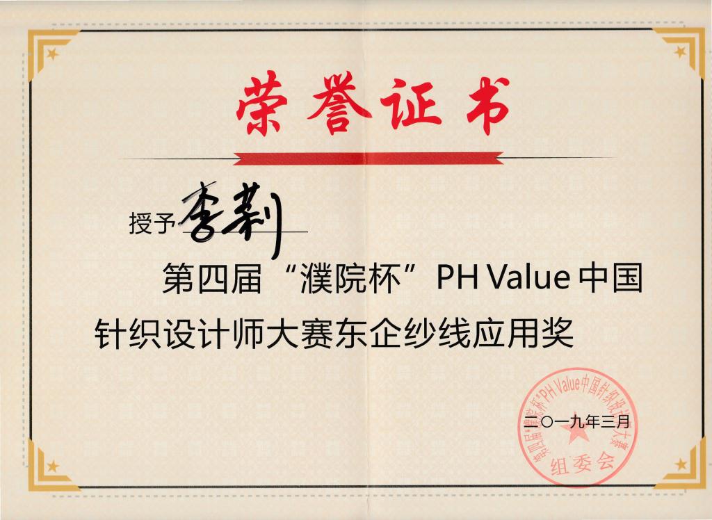 纺织服装学院师生在此次大赛中表现突出,取得了优异成绩。来自江苏省非物质文化遗产研究基地的2018级研究生李莉凭借作品《barroco》(巴洛克)荣获二等奖以及东企纱线应用奖两项大奖,并被授予“针织设计师”称号。