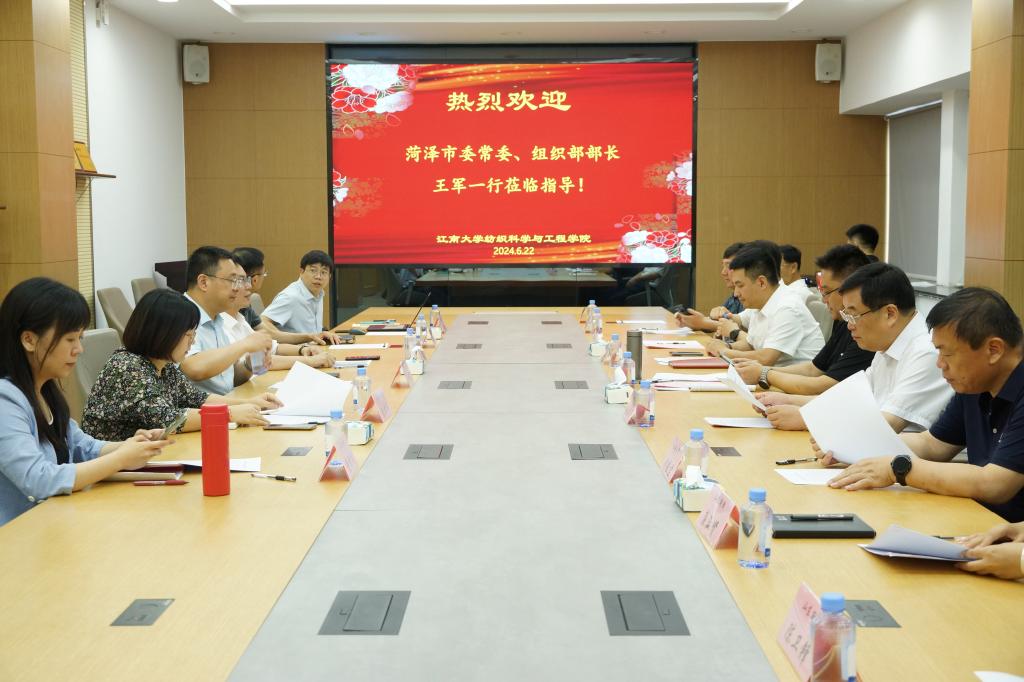 6月22日下午,菏泽市委常委、组织部部长王军,菏泽市政协副主席、单县县委书记耿振华带队来院开展产才对接交流活动。学院院长付少海,副院长、针织技术教育部工程研究中心材料室主任马丕波,副院长张丽平等出席了座谈会。