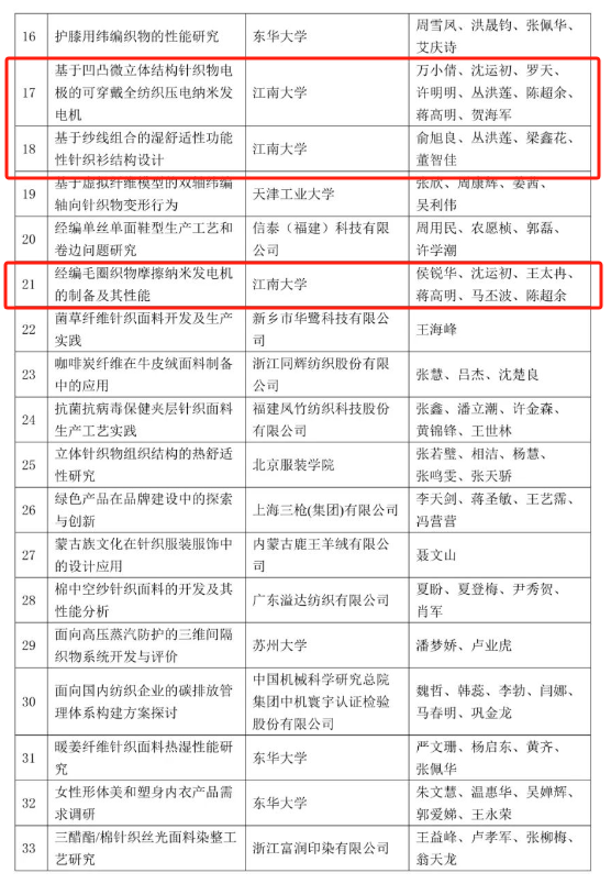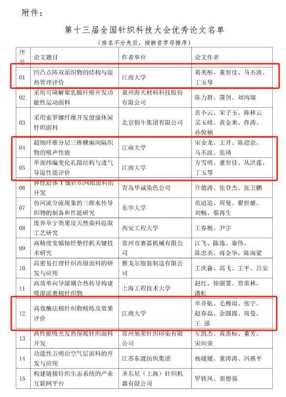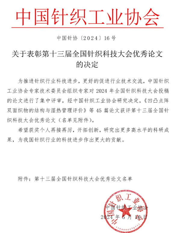 《凹凸点阵双面织物的结构与湿热管理评价》《超细纤维分层三维横编间隔织物的吸声性能》等8篇论文获评第十三届全国针织科技大会优秀论文(共评选出45篇),中国针织工业协会专家技术委员会主任瞿静、常务副主任杨启东为获奖者颁发了证书。