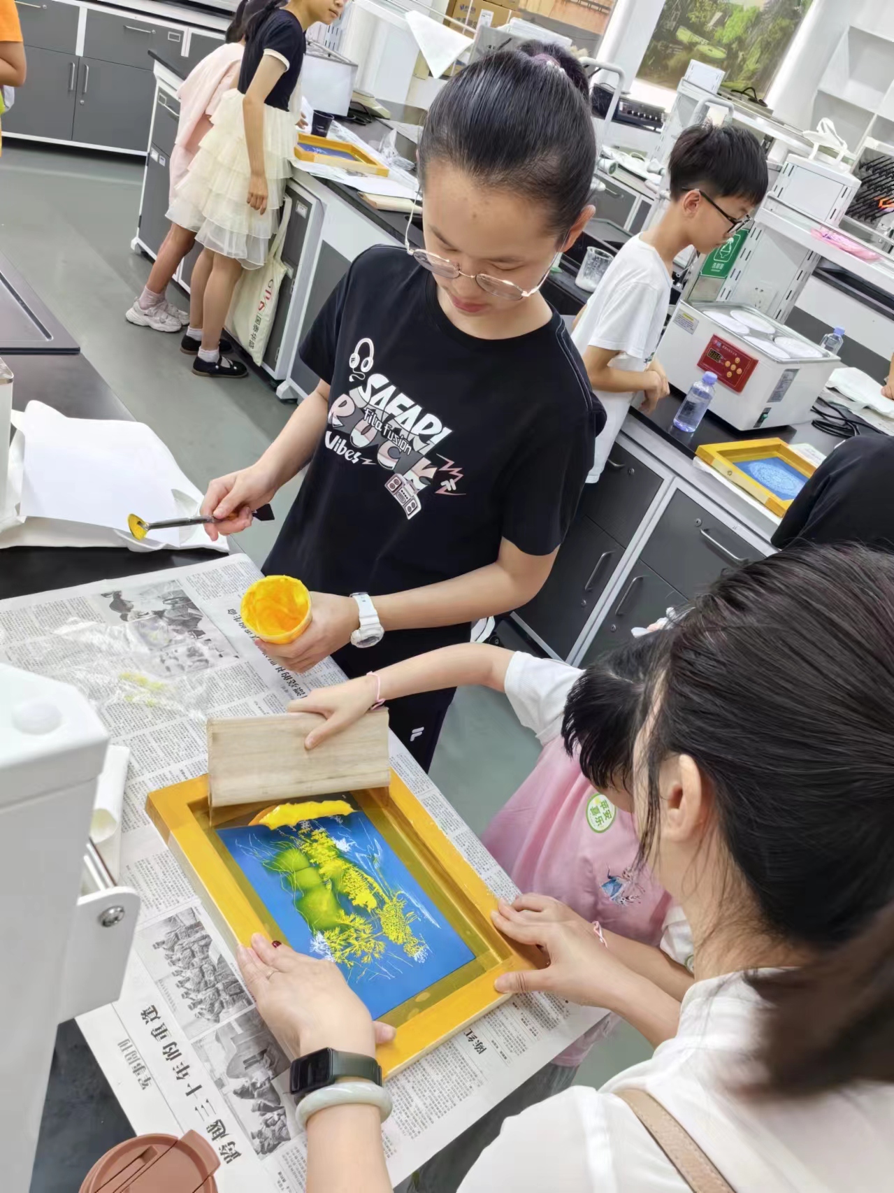 民间服饰传习馆。馆内陈列丰富的实物展示与详细讲解,让他们对我国传统服饰的历史、文化内涵及制作工艺有了更为深刻的认识。随后,在专业指导老师的悉心指导下,学生们亲自动手体验了丝网印刷这一传统工艺。这一实践环节,让他们不仅感受到了服饰染整技术的魅力,还加深了对纺织品知识的理解,收获了满满的成就感和喜悦。