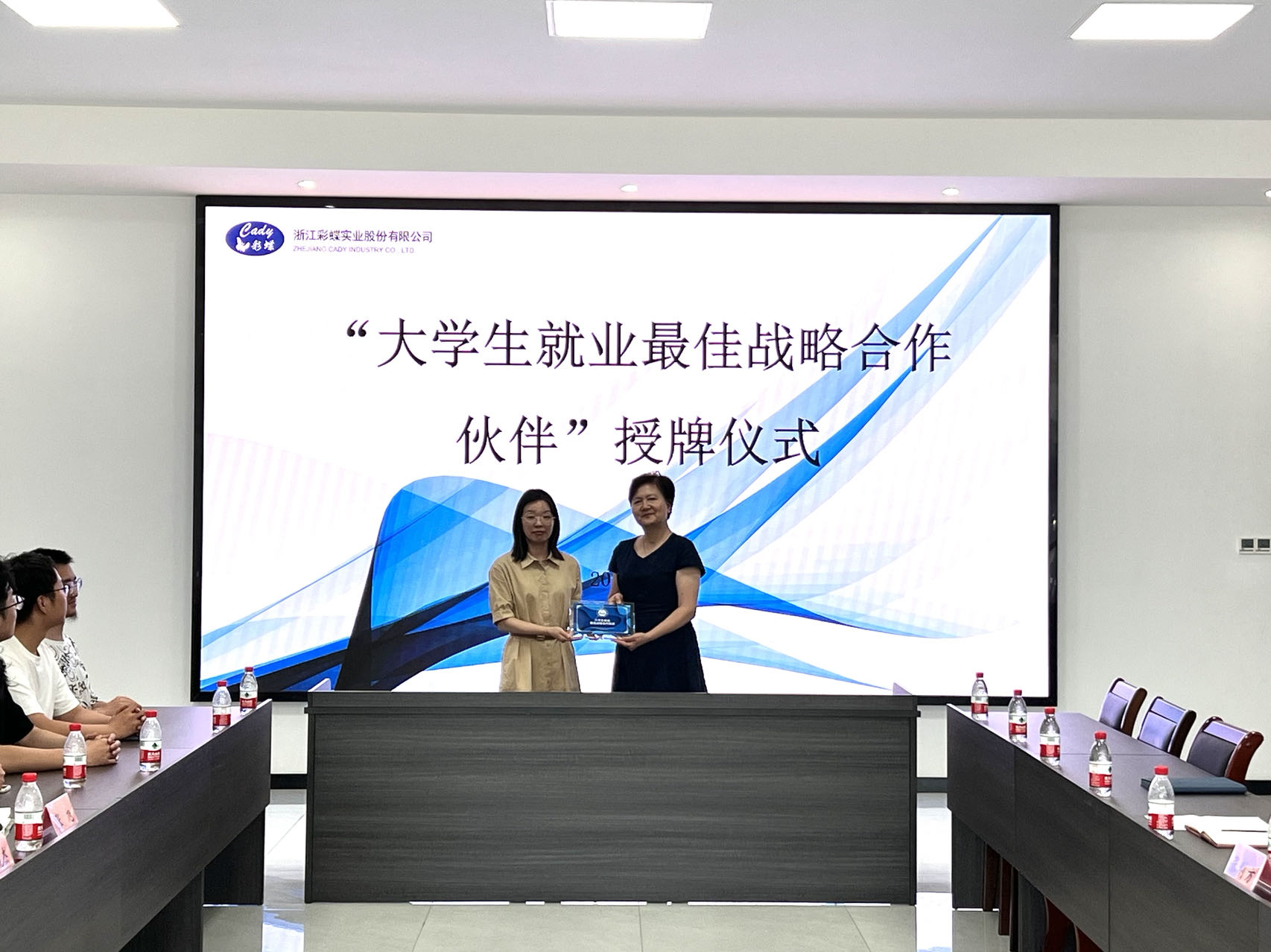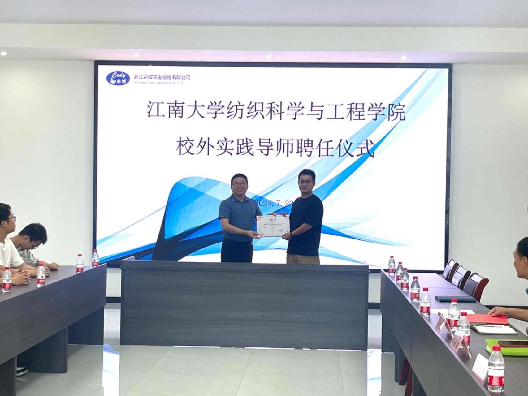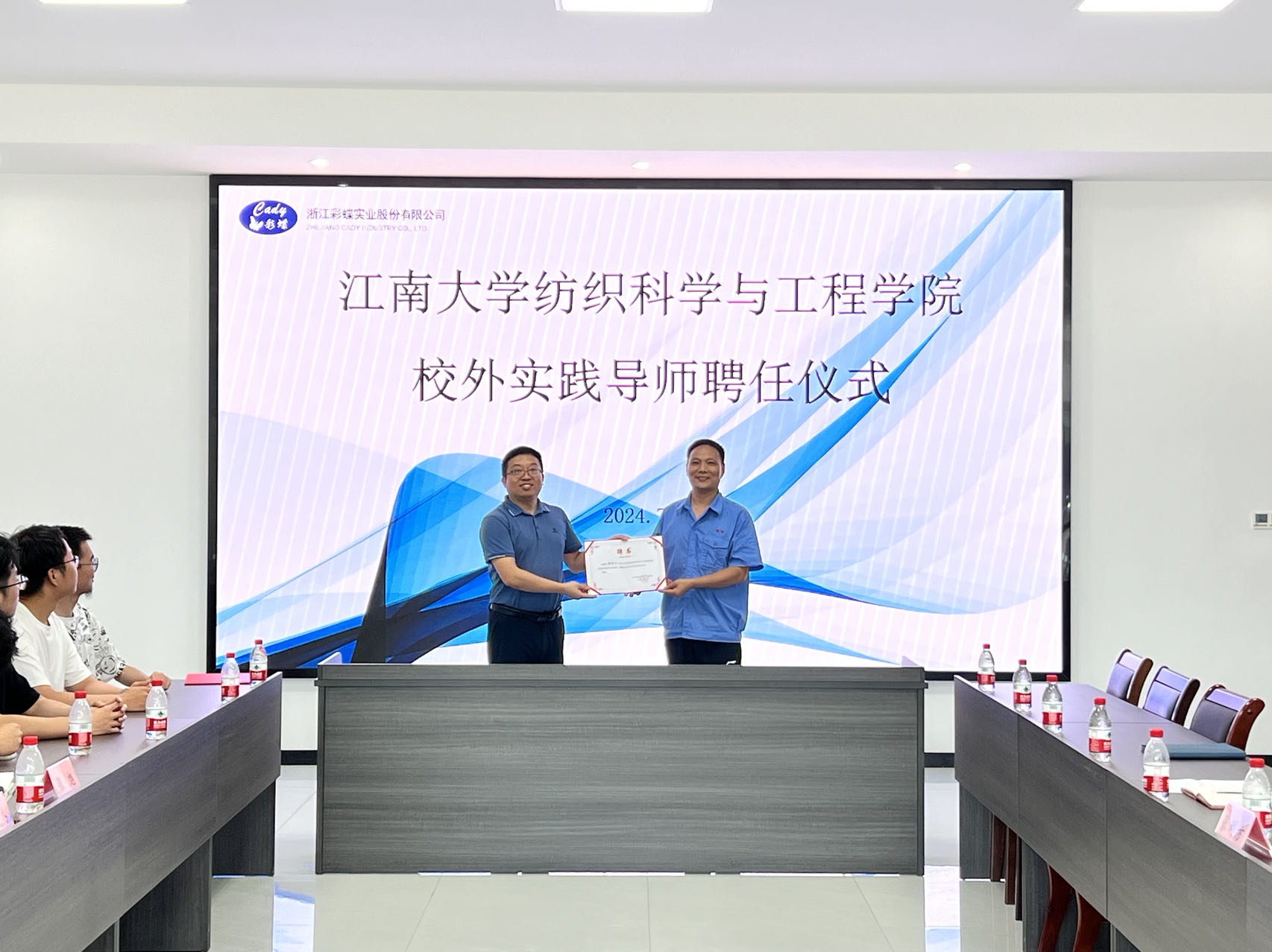 “校外教学实习基地”和“大学生就业最佳合作伙伴”铭牌。殷允杰为织造分厂厂长董旭明和染整分厂厂长张利方颁发“校外实践导师”聘书。